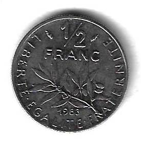 1/2 франка 1983 Франция Страна: Франция Номер по Краузе: KM# 931.1 Год: 1983 Буквы: Материал: Никель Диаметр: 19.5 мм. Вес: 4.5 г. Взаиморасположение аверса и реверса: монетное Тип гурта: ребристый. Качество: XF