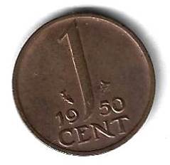 1 цент 1904 Нидерланды Страна: Нидерланды Номер по Краузе: KM# 180 Год: 1950 Буквы: Материал: Бронза Диаметр: 14 мм. Вес: 2.00 гр. Взаиморасположение аверса и реверса: монетное Тип гурта: гладкий. Качество: XF
