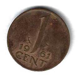 1 цент 1961 Нидерланды Страна: Нидерланды Номер по Краузе: KM# 180 Год: 1961 Буквы: Материал: Бронза Диаметр: 14 мм. Вес: 2.00 гр. Взаиморасположение аверса и реверса: монетное Тип гурта: гладкий. Качество: XF