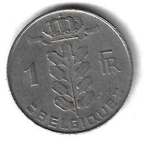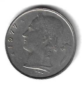 1 франк 1977 Бельгия Страна: Бельгия Номер по Краузе: KM# 142.1 Год: 1977 Буквы: BELGIQUE Материал: Медно-никелевый сплав Диаметр: 21 мм. Вес: 4 г. Взаиморасположение аверса и реверса: монетное Тип гурта: ребристый. Качество: XF