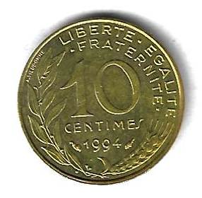 10 сантимов 1994 Франция Страна: Франция Номер по Краузе: KM# 929 Год: 1994 Буквы: Материал: Алюминиевая бронза Диаметр: 20 мм. Вес: 3 г. Взаиморасположение аверса и реверса: монетное Тип гурта: гладкий. Качество: XF