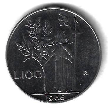 100 лир 1966 Италия Страна: Италия Номер по Краузе: KM# 96.1 Год: 1966 Буквы: Материал: Нержавеющай сталь Диаметр: 27.8 мм. Вес: 8 г. Взаиморасположение аверса и реверса: монетное Тип гурта: рубчатый Качество: XF