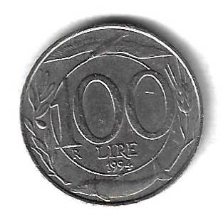 100 лир 1994 Италия Страна: Италия Номер по Краузе: KM# 159 Год: 1994 Буквы: Материал: Медно-никелевый сплав Диаметр: 22 мм. Вес: 4.5 г. Взаиморасположение аверса и реверса: монетное Тип гурта: прерывисто-рубчатый Качество: XF