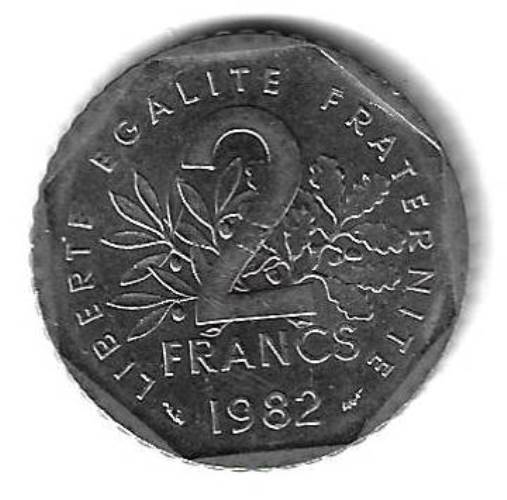 2 франка 1982 Франция Страна: Франция Номер по Краузе: KM# 942.1 Год: 1982 Буквы: Материал: Никель Диаметр: 26.5 мм. Вес: 7.5 г. Взаиморасположение аверса и реверса: монетное Тип гурта: ребристый. Качество: XF