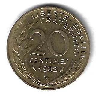 20 сантимов 1982 Франция Страна: Франция Номер по Краузе: KM# 930 Год: 1982 Буквы: Материал: Алюминиевая бронза Диаметр: 23.5 мм. Вес: 4 г. Взаиморасположение аверса и реверса: монетное Тип гурта: гладкий. Качество: XF