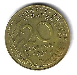 20 сантимов 1991 Франция Страна: Франция Номер по Краузе: KM# 930 Год: 1991 Буквы: Материал: Алюминиевая бронза Диаметр: 23.5 мм. Вес: 4 г. Взаиморасположение аверса и реверса: монетное Тип гурта: гладкий. Качество: XF