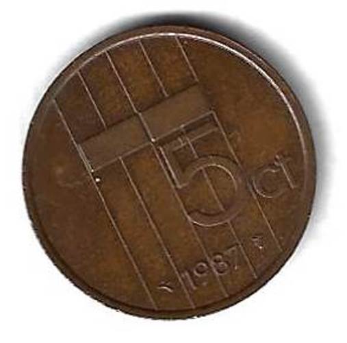 5 центов 1987 Нидерланды Страна: Нидерланды Номер по Краузе: KM# 202 Год: 1987 Буквы: Материал: Бронза Диаметр: 21 мм. Вес: 3.50 гр. Взаиморасположение аверса и реверса: медальное Тип гурта: гладкий. Качество: XF