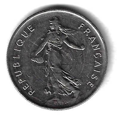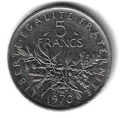 5 франков 1970 Франция Страна: Франция Номер по Краузе: KM# 926a.1 Год: 1970 Буквы: Материал: Никелированный медно-никелевый сплав Диаметр: 29 мм. Вес: 10 г. Взаиморасположение аверса и реверса: монетное Тип гурта: ребристый. Качество: XF