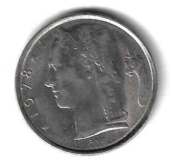 5 франков 1978 Бельгия Страна: Бельгия Номер по Краузе: KM# 134.1 Год: 1978 Буквы: BELGIQUE Материал: Медноникелевый сплав Диаметр: 24 мм. Вес: 6 г. Взаиморасположение аверса и реверса: монетное Тип гурта: ребристый. Качество: XF