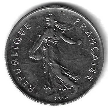 5 франков 1991 Франция Страна: Франция Номер по Краузе: KM# 926a.1 Год: 1991 Буквы: Материал: Никелированный медно-никелевый сплав Диаметр: 29 мм. Вес: 10 г. Взаиморасположение аверса и реверса: монетное Тип гурта: ребристый. Качество: XF