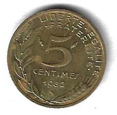 5 сантимов 1982 Франция Страна: Франция Номер по Краузе: KM# 933 Год: 1982 Буквы: Материал: Алюминиевая бронза Диаметр: 17 мм. Вес: 2 г. Взаиморасположение аверса и реверса: монетное Тип гурта: гладкий. Качество: XF