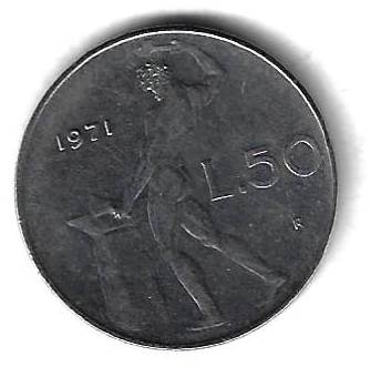 50 лир 1971 Италия Страна: Италия Номер по Краузе: KM# 95.1 Год: 1971 Буквы: Материал: Нержавеющай сталь Диаметр: 24.8 мм. Вес: 6.25 г. Взаиморасположение аверса и реверса: монетное Тип гурта: рубчатый Качество: XF
