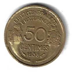 50 сантимов 1938 Франция Страна: Франция Номер по Краузе: KM# 894.1 Год: 1938 Буквы: Материал: Алюминиевая бронза Диаметр: 18 мм. Вес: 2 гр. Взаиморасположение аверса и реверса: монетное Тип гурта: гладкий. Качество: XF