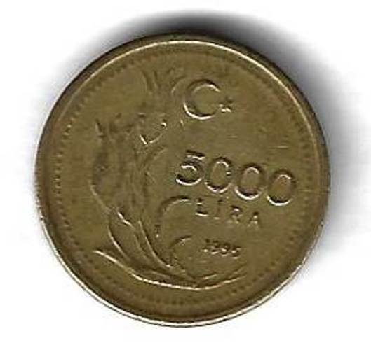 5000 лир 1995 Турция Страна: Турция Номер по Краузе: KM# 1029.1 Год: 1995 Буквы: Материал: Латунь Диаметр: 19.5 мм. Вес: 6 г. Взаиморасположение аверса и реверса: монетное Тип гурта: рубчатый Качество: XF