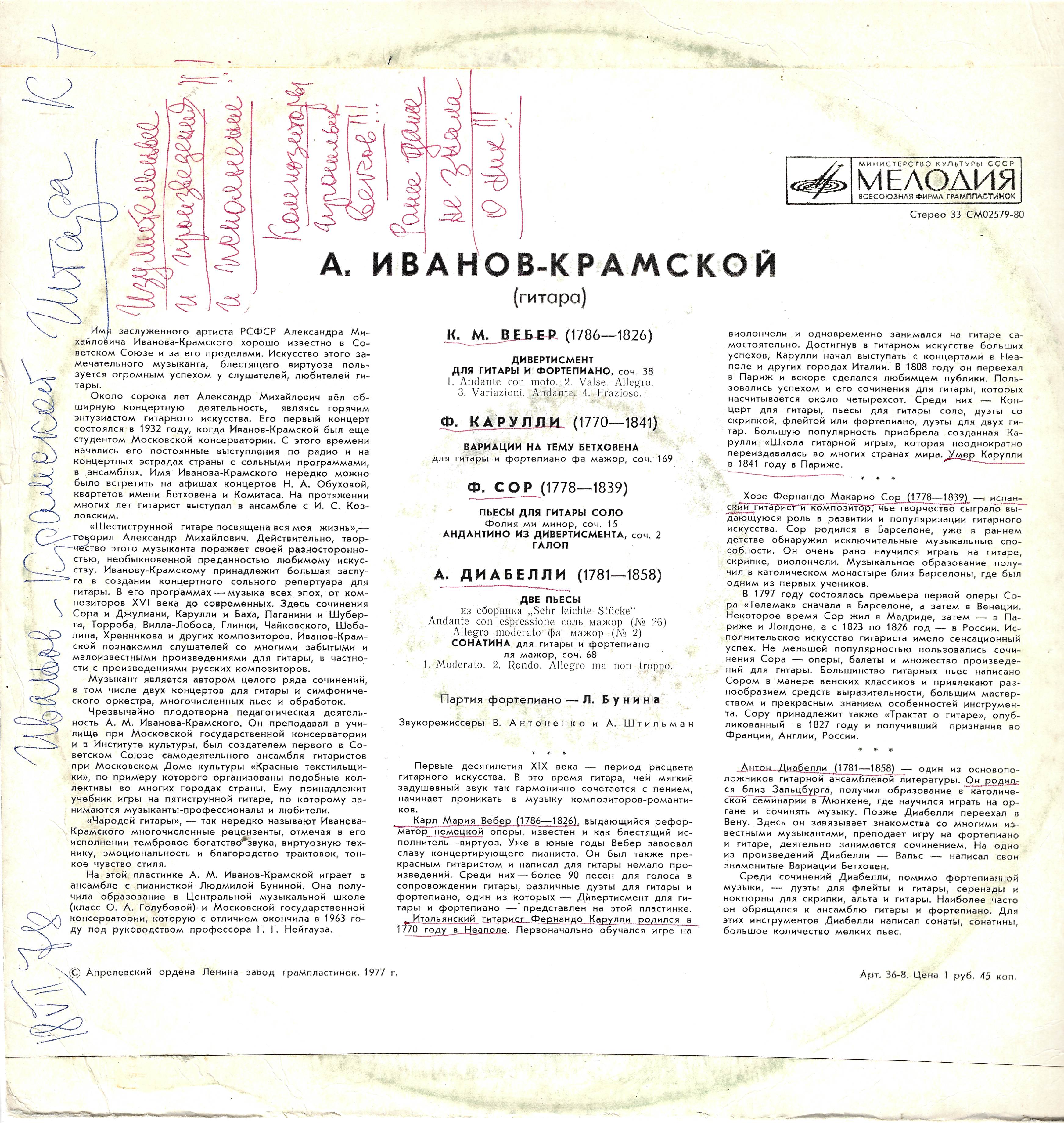 На этой пластинке А. М. Иванов-Крамской играет в ансамбле с пианисткой Людмилой Буниной. Она получила образование в Центральной музыкальной школе (класс О. А. Голубовой) и Московской государственной консерватории, которую с отличием окон-7 чила в 1963 году под руководством профессора Г. Г. Нейгауза.