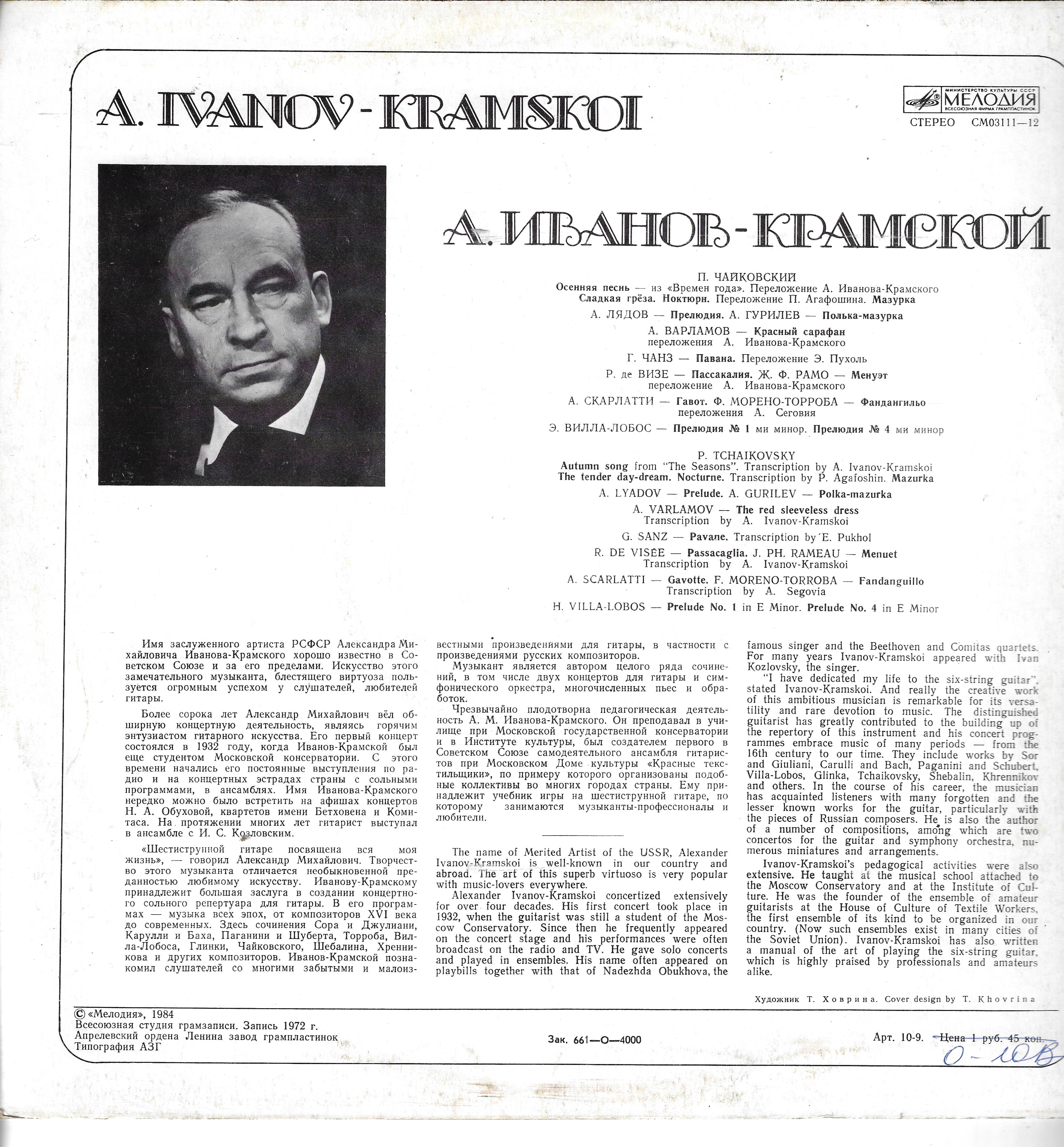 Имя заслуженного артиста РСФСР Александра Михайловича Иванова-Крамского хорошо известно в Советском Союзе и за его пределами. Искусство этого замечательного музыканта, блестящего виртуоза пользуется огромным успехом у слушателей, любителей гитары.