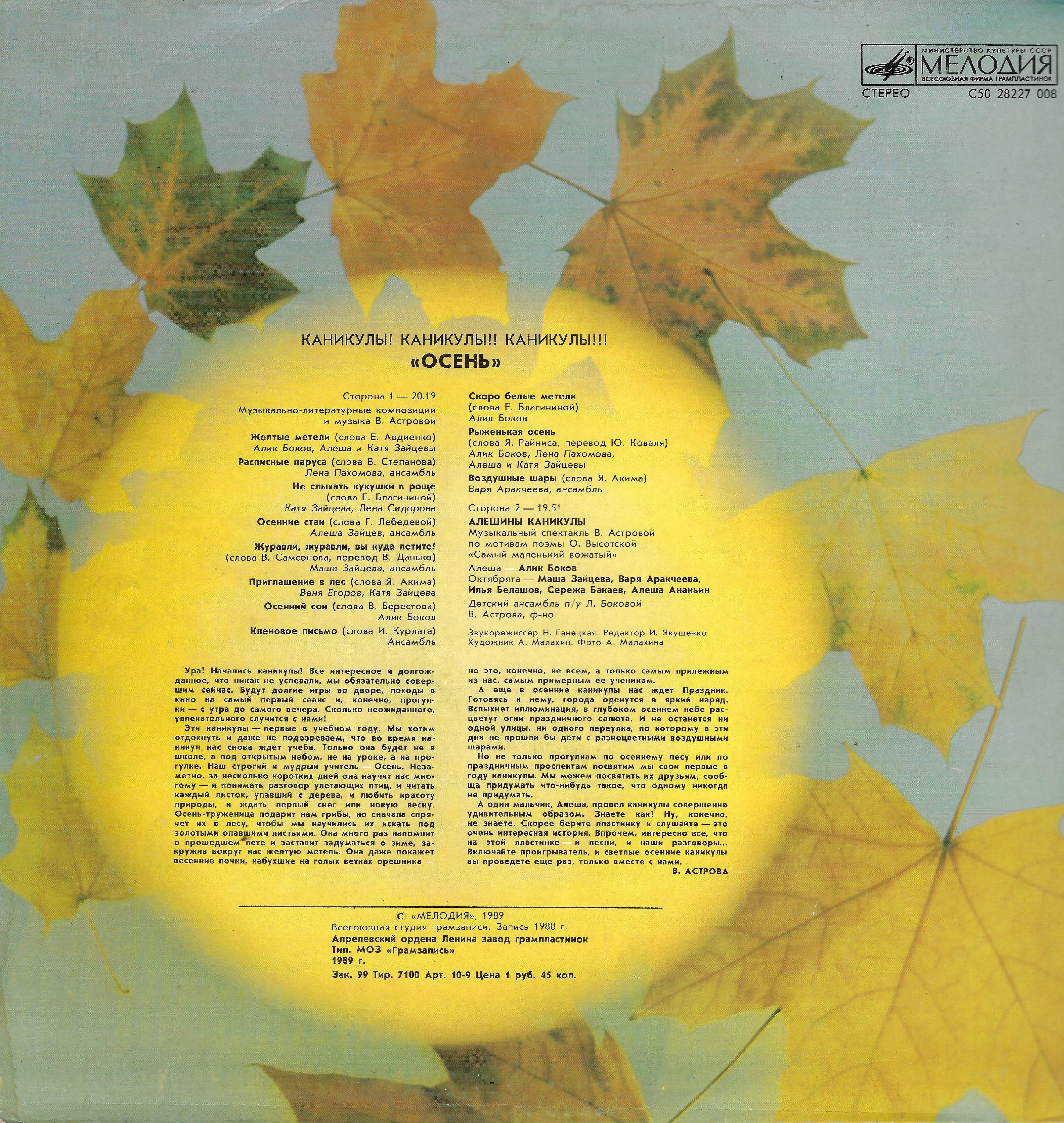 А один мальчик, Алеша, провел каникулы совершенно удивительным образом. Знаете как! Ну, конечно, не знаете. Скорее берите пластинку и слушайте — это очень интересная история. Впрочем, интересно все, что на этой пластинке — и песни, и наши разговоры... Включайте проигрыватель, и светлые осенние каникулы вы проведете еще раз, только вместе с нами.