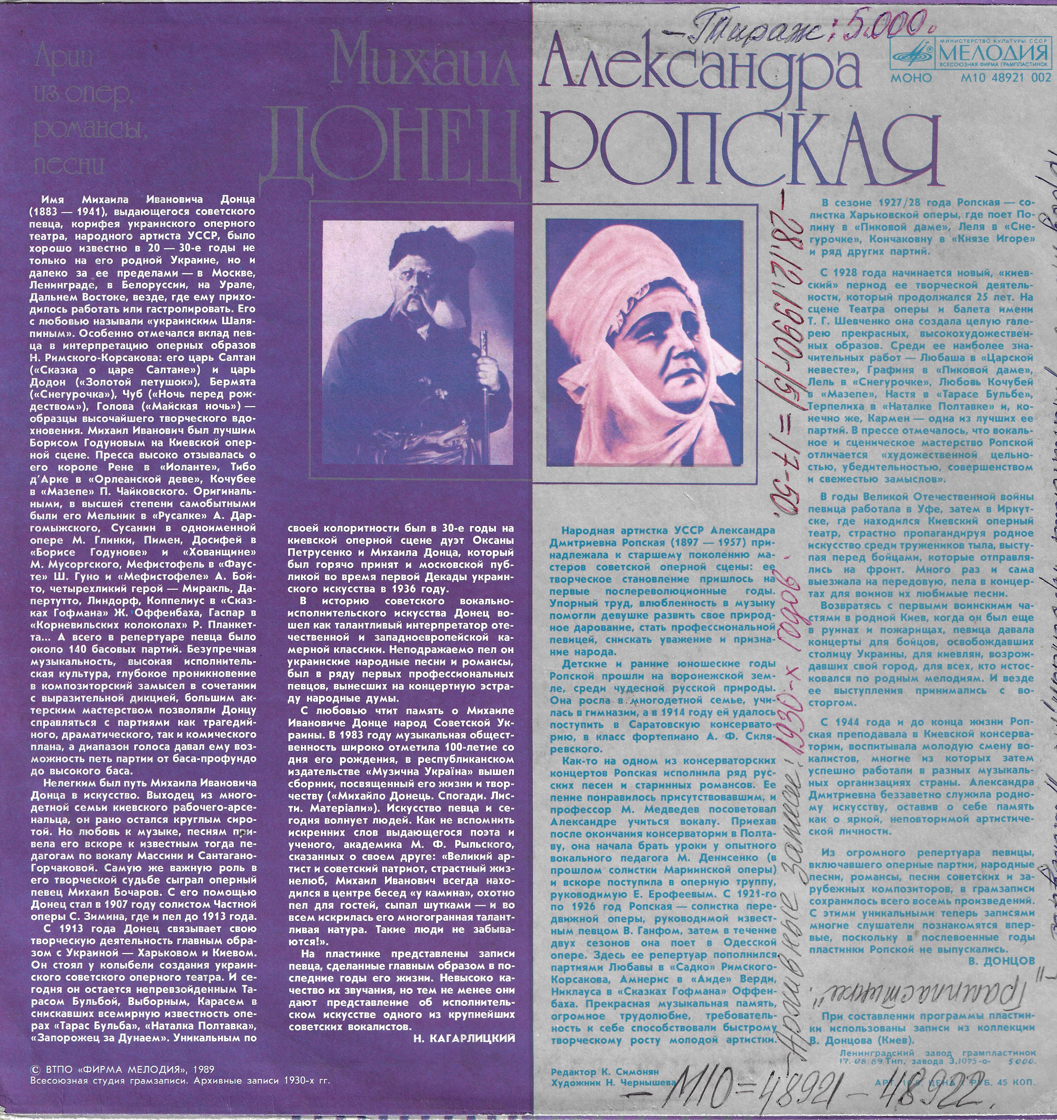 При составлении программы пластинки использованы записи из коллекции В. Донцова (Киев).