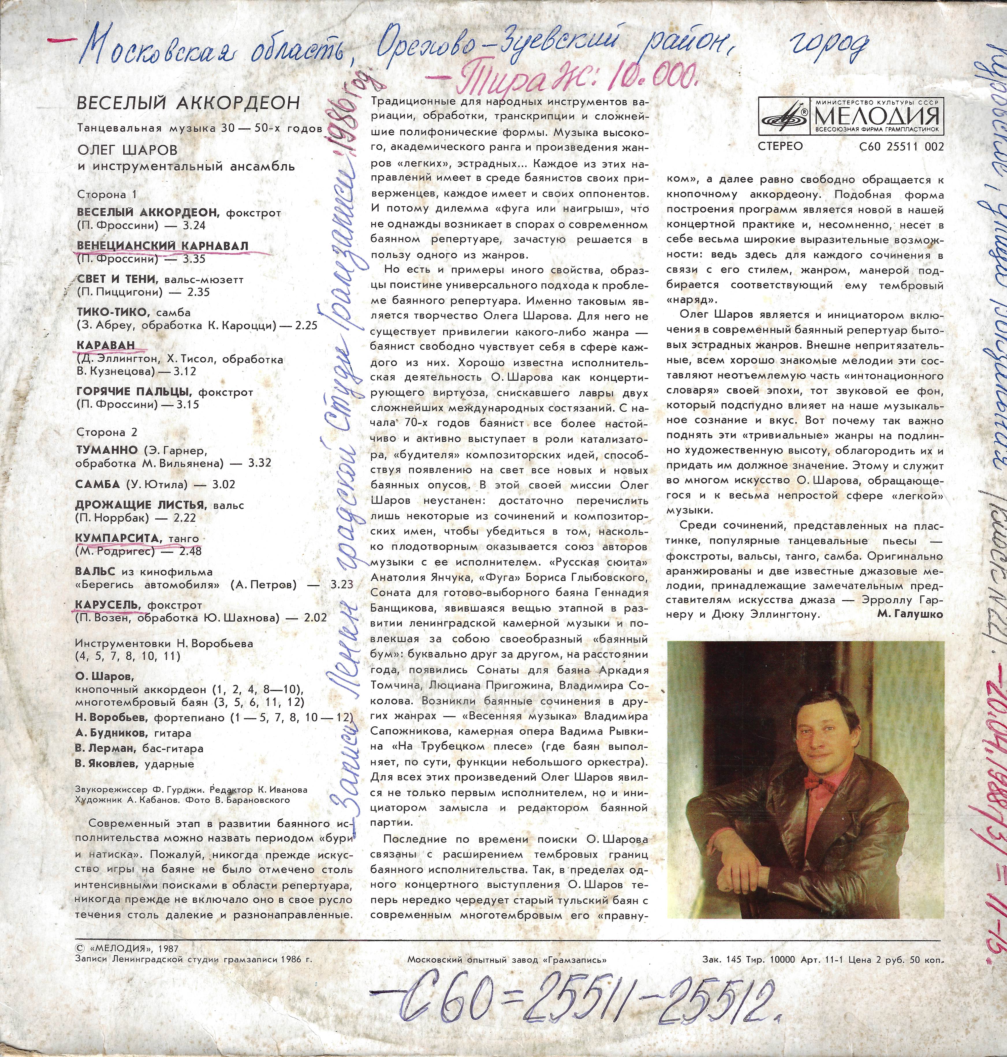 О. Шаров, кнопочный аккордеон (1, 2, 4, 8—10), многотембровый баян (3, 5, 6, 11, 12)