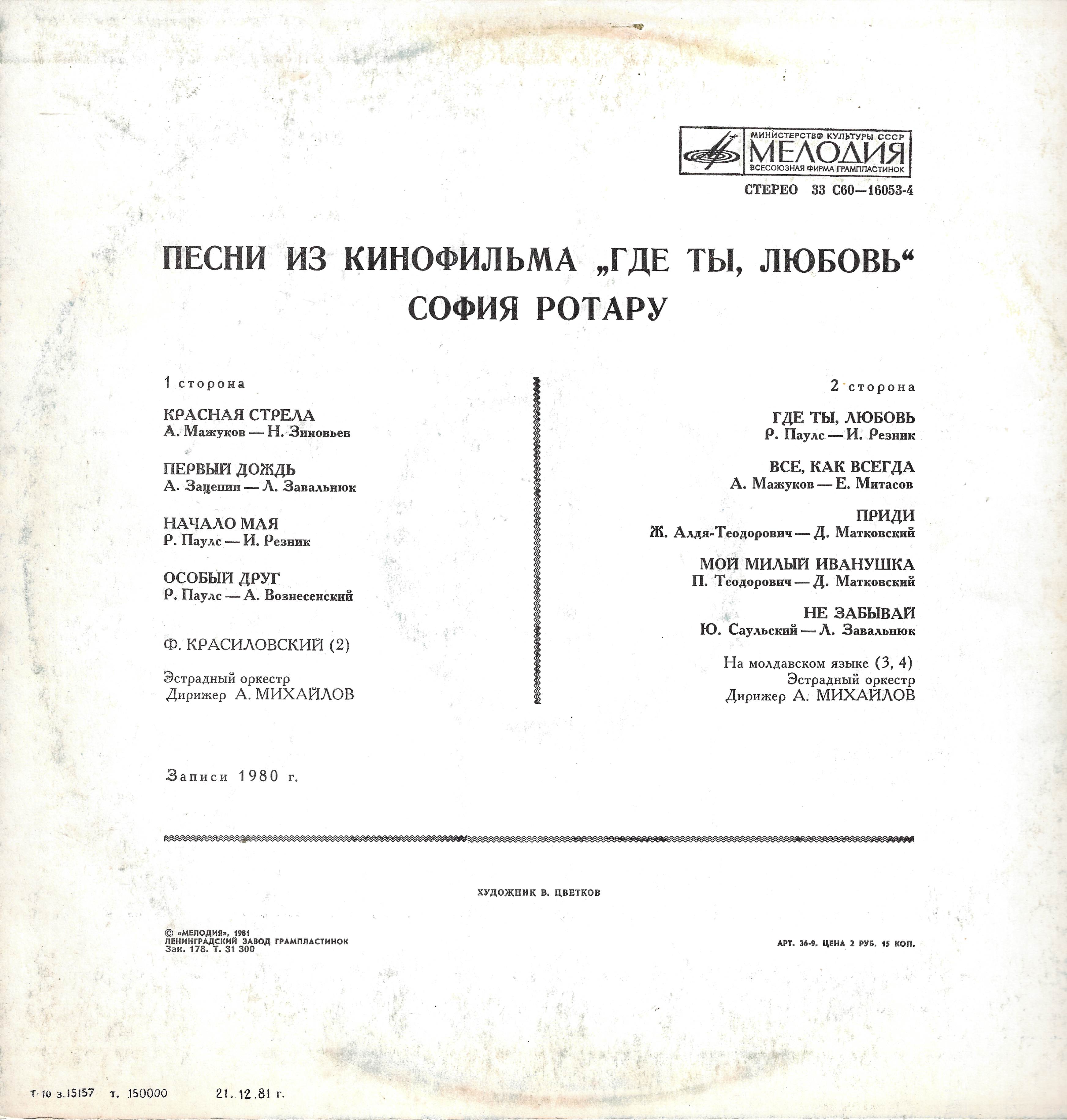 София Ротару - Песни из к/ф "Где ты, любовь"/ София Ротару и ансамбль "Червона рута" (1-я пластинка)