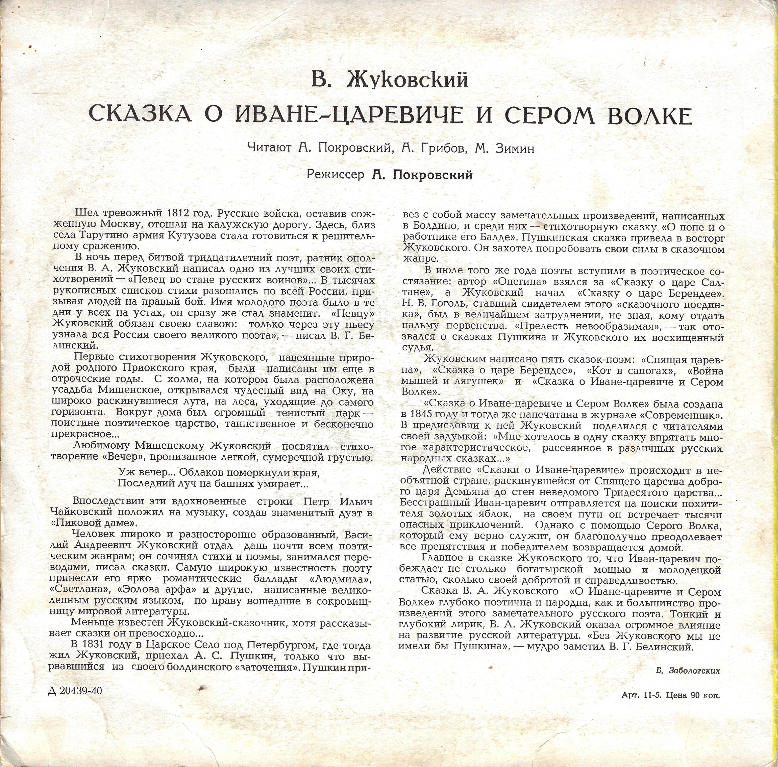 Меньше известен Жуковский-сказочник, хотя рассказывает сказки он превосходно... В 1831 году в Царское Село под Петербургом, где тогда жил Жуковский, приехал А. С. Пушкин, только что вырвавшийся из своего болдинского «заточения». Пушкин привез с собой массу замечательных произведений, написанных в Болдино, и среди них — стихотворную сказку «О попе и о работнике его Балде». Пушкинская сказка привела в восторг Жуковского. Он захотел попробовать свои силы в сказочном жанре.