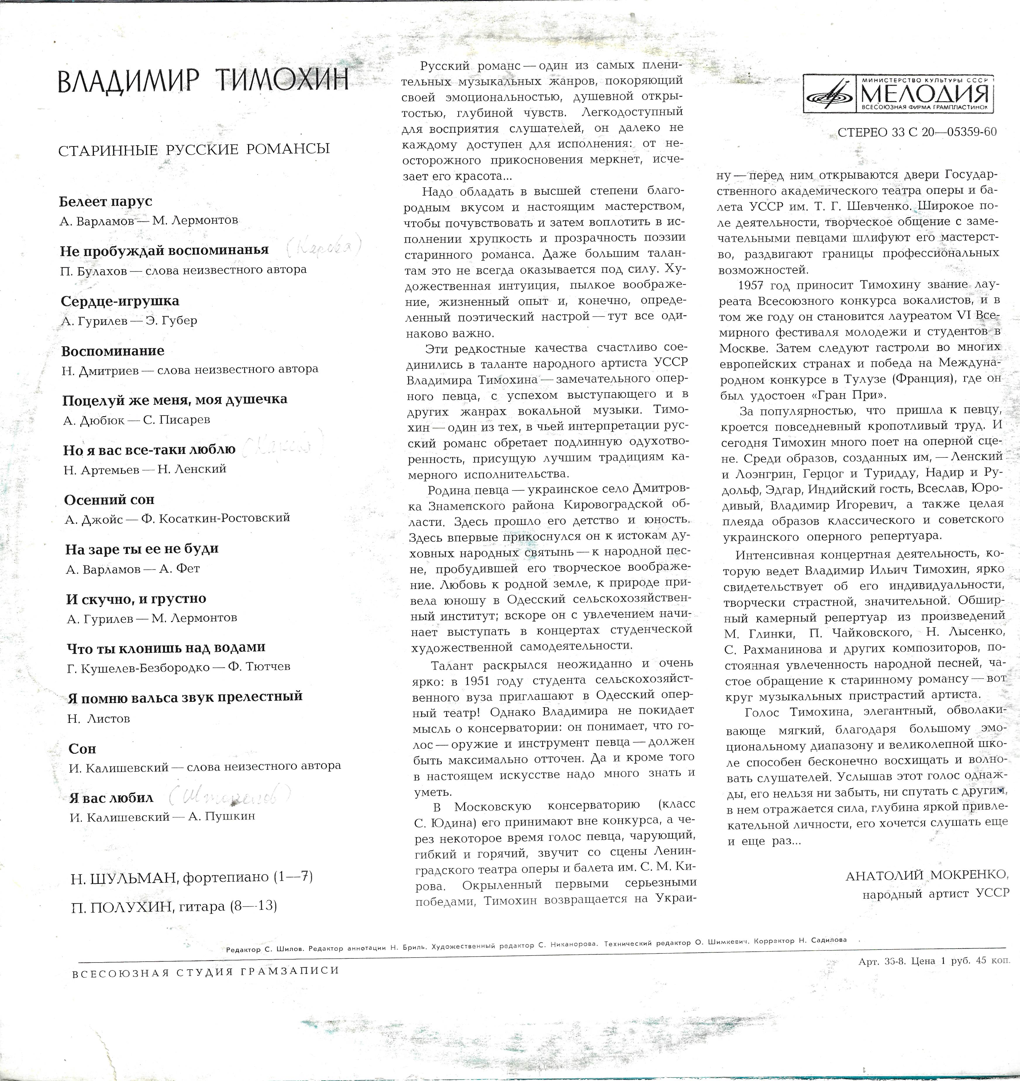 Эти редкостные качества счастливо соединились в таланте народного артиста УССР Владимира Тимохина — замечательного оперного певца, с успехом выступающего и в других жанрах вокальной музыки. Тимохин — один из тех, в чьей интерпретации русский романс обретает подлинную одухотворенность, присущую лучшим традициям камерного исполнительства.