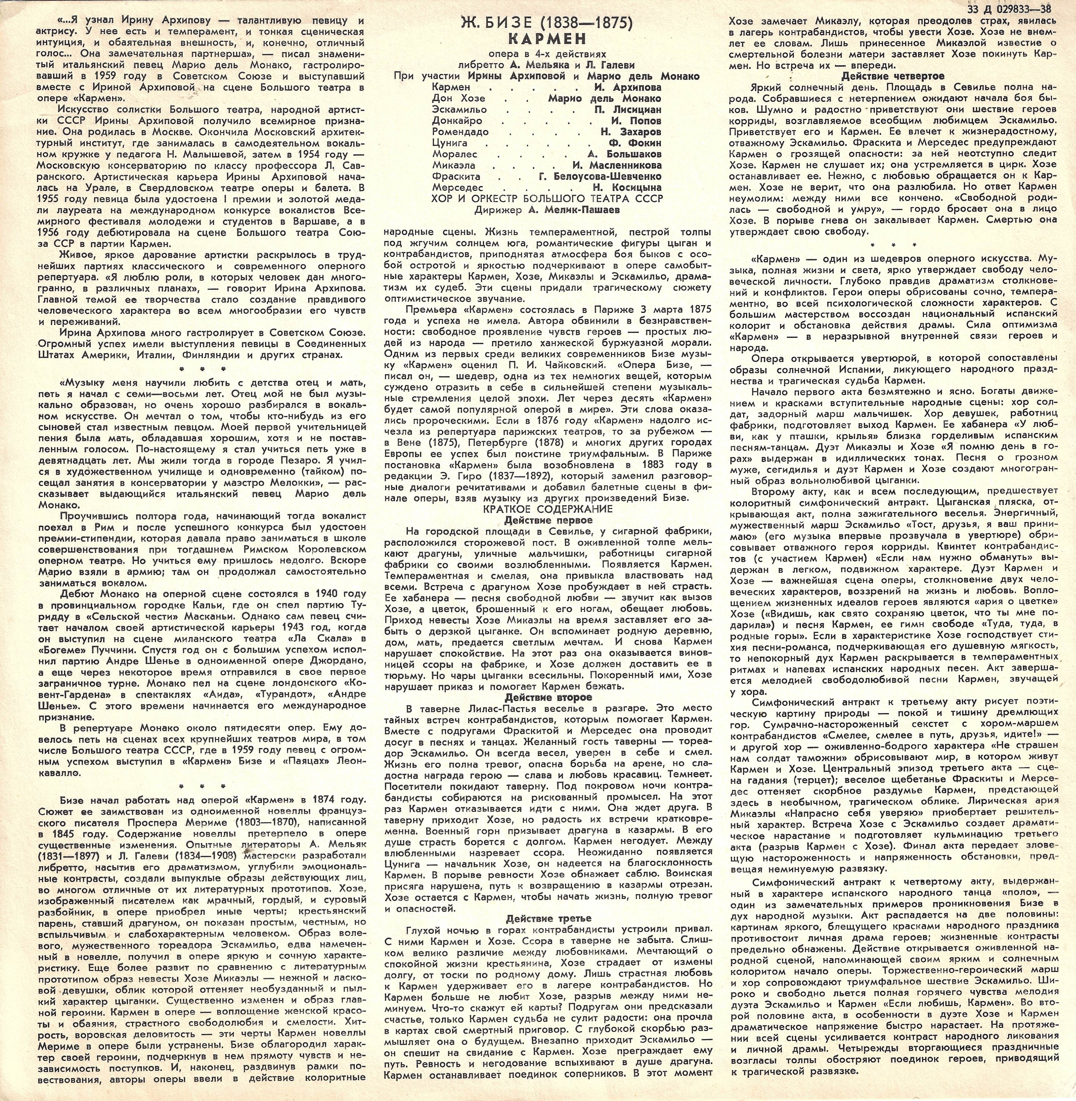 Ж. Бизе – Кармен, опера в 4-х действиях. Либретто А. Мельяка и Л. Галеви. При участии Ирины Архиповой и Марио дель Монако (3 пластинки)